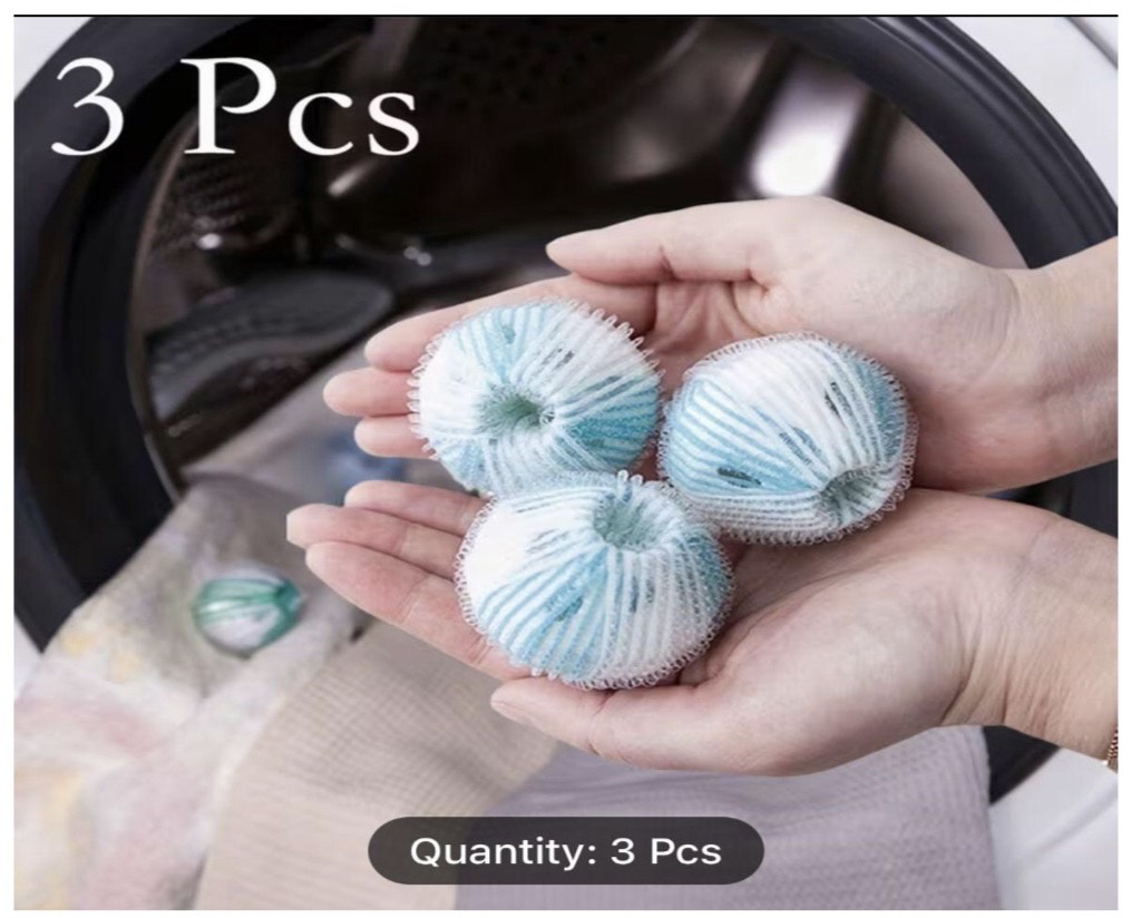 3-in-1 laundry balls that remove hair, lint, and stains while keeping clothes tangle-free, perfect for pet owners and everyday washing.